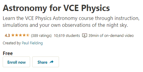 This course covers the content as prescribed by VCAA for the Unit 1,2 Physics Detailed Study of Astronomy.