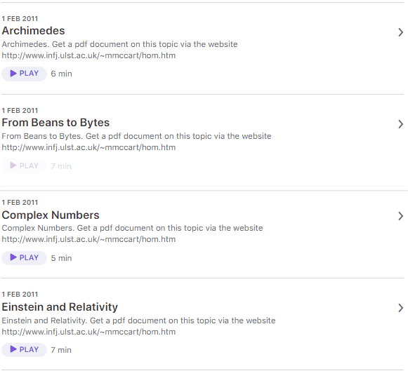 Mathematics has been done in particular times and places for thousands of years. Behind the theorems, equations, techniques and applications taught in the lecture room is a history of false starts, astonishing breakthroughs, remarkable personalities, fruitful collaborations, misattribution of credit, and disputes over who discovered what first. A series of stories, in fact. The materials aim to give students some of the history which lies behind a selection of the famous names and equations in mathematics. Each topic comprises a ‘stand alone’ two page pdf suitable to be ‘dropped’ into lecture notes and an accompanying mp3 file based on the pdf. This podcast provides the mp3 files and the pdf documents can be found on the website http://www.infj.ulst.ac.uk/~mmccart/hom.htm These materials are freely available for educational use. We would like to hear from any tutors or students who use these resources – please tell us how you use them and how far they meet your needs.